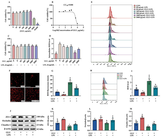 As shown in Figure 12A, GLU treatment showed no negative effect on cell viability when its treatment concentration did not exceed 1000 μg/mL. However, GLU treatment at concentrations of 5000 μg/mL and 10,000 μg/mL significantly reduced the cell viability (p < 0.05). In addition, the CC50 of GLU was estimated to be 5300 μg/mL using GraphPad analysis (Figure 12B). Notably, compared with the control group, treatment with 1000 μg/mL GLU significantly increased the cell viability of LPS-challenged IPEC-J2 cells (p < 0.05) (Figure 12C). Meanwhile, treatment with 1000 μg/mL GLU significantly reduced the accumulation of ROS in LPS-challenged IPEC-J2 cells (p < 0.05), and there was no significant difference compared to the blank control group (Figure 12D,E). Based on these results, GLU at a concentration of 1000 μg/mL was selected for subsequent experiments.