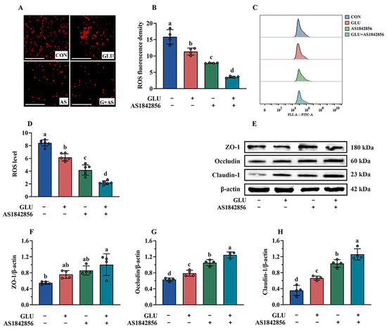 Effect of GLU treatment on the ROS levels and tight junctions in AS1842856-challenged IPEC-J2 cells. (A–D) The ROS levels in IPEC-J2 cells, scale bar 500 μm; (E–H) Western blot analysis of the tight junctions. Values are expressed as the mean ± SEM (n = 4). Different letters (abcd) indicate significant differences.