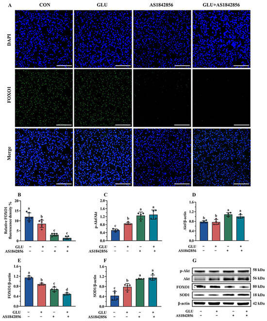 Effect of GLU treatment on the Akt/FOXO1/SOD1 pathway in AS1842856-challenged IPEC-J2 cells. (A,B) The immunofluorescence microscopy of FOXO1 in IPEC-J2 cells, scale bar 500 μm; (C–G) Western blot analysis of the Akt/FOXO1/SOD1 pathway. Values are expressed as the mean ± SEM (n = 4). Different letters (abcd) indicate significant differences.