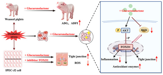 Glucuronolactone restores the intestinal barrier and redox balance partly through the Nrf2/Akt/FOXO1 pathway to alleviate weaning-stress-induced intestinal dysfunction in piglets. The red arrows pointing upward indicates upregulation, while the arrow pointing downward indicates downregulation.