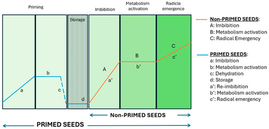 Illustrative graph depicting the phases of germination in non-primed and primed seeds (designed by the authors).