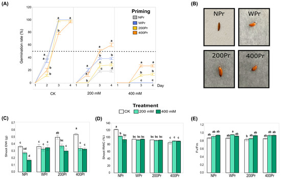 Influence of priming on the percentage of C. maritima seed germination under different NaCl conditions over 4 days. The dotted line indicates the 50% germination rate (A), Pictures of seeds from different priming groups (B), Biomass production expressed as dry weight (C), Relative water content (D), and Photosynthetic efficiency (E) in shoots of C. maritima plants grown from non-primed (NPr) and primed seeds (WPr, 200Pr, 400Pr) under different NaCl treatments (CK, 200 mM, and 400 mM NaCl) for 7 days. Values are presented as the mean ± SE (n = 6), except for the germination (n = 3; 20 seeds per replicate). Different letters indicate significant differences between treatments and priming groups, except in (A), in which they indicate differences only between priming groups per day (Tukey test, p < 0.05).