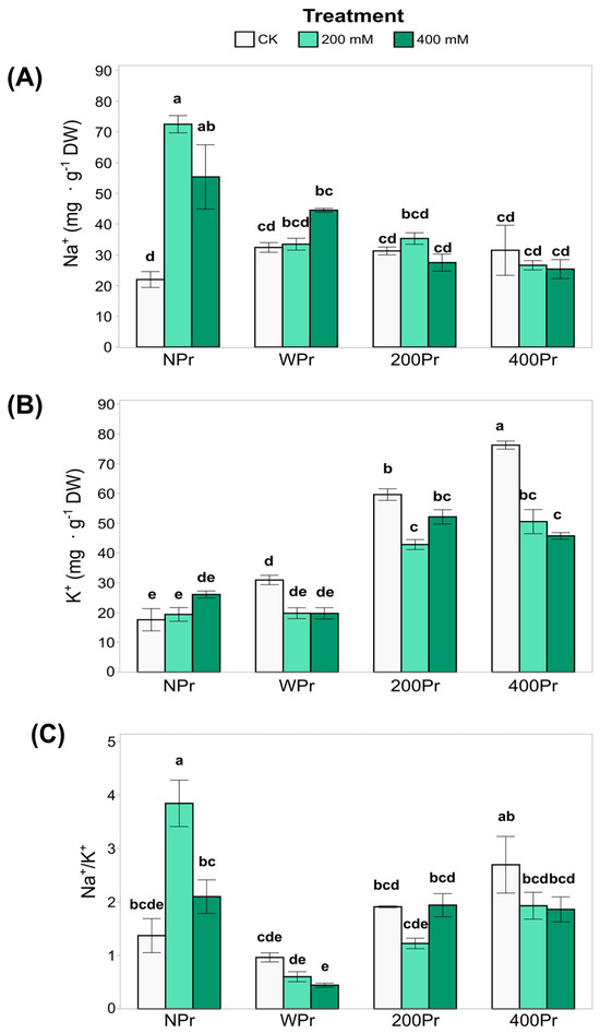 Concentration of Na+ (A) and K+ (B), and the ratio Na+/K+ (C) in shoots of C. maritima plants grown from non-primed (NPr) and primed seeds (WPr, 200Pr, 400Pr) under different NaCl treatments (CK, 200 mM, and 400 mM NaCl) for 7 days. Values are presented as the mean ± SE (n = 6). Different letters indicate significant differences (Tukey test, p < 0.05).