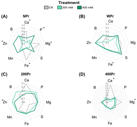 Radial plots showing shoot normalized mineral nutrient differences of C. maritima plants grown from non-primed (NPr) (A) and primed seeds (WPr (B), 200Pr (C), 400Pr (D)) under different NaCl treatments (CK, 200 mM, and 400 mM NaCl) for 7 days. Axes display Z-scores calculated per element (n = 6). Asterisks indicate significant differences in at least one treatment (Tukey test, p < 0.05).