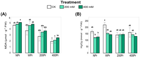 Concentration of malondialdehyde (A) and hydrogen peroxide (B) in shoots of C. maritima plants grown from non-primed (NPr) and primed seeds (WPr, 200Pr, 400Pr) under different NaCl treatments (CK, 200 mM, and 400 mM NaCl) for 7 days. Values are presented as the mean ± SE (n = 6). Different letters indicate significant differences (Tukey test, p < 0.05).