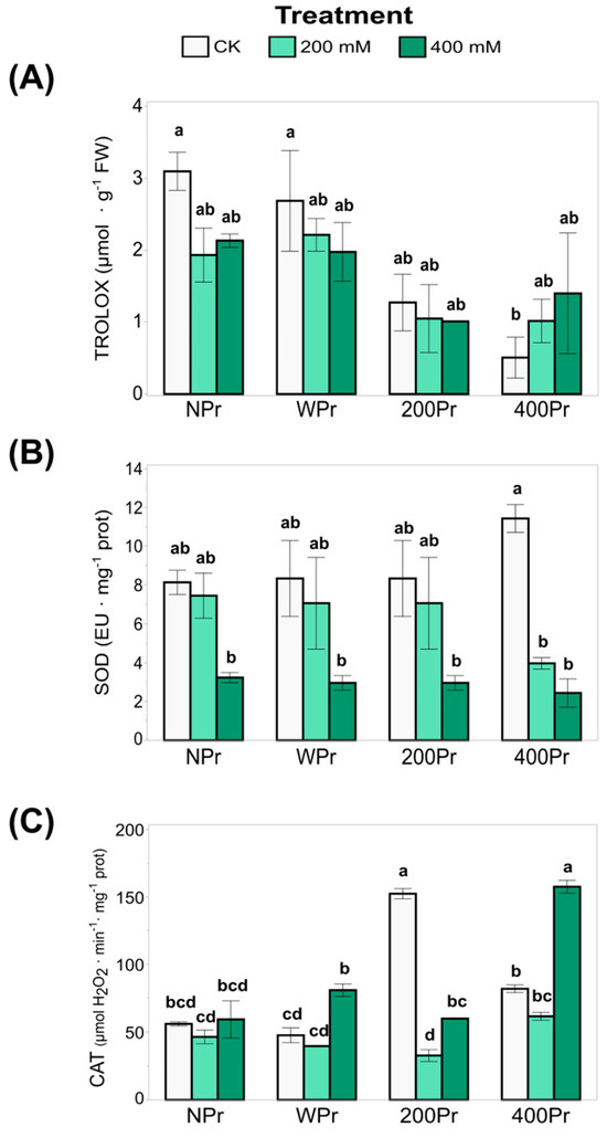 The total antioxidant capacity (A), SOD activity (B), and CAT activity (C) in shoots of C. maritima plants grown from non-primed (NPr) and primed seeds (WPr, 200Pr, 400Pr) under different NaCl treatments (CK, 200 mM, and 400 mM NaCl) for 7 days. Values are presented as the mean ± SE (n = 6). Different letters indicate significant differences (Tukey test, p < 0.05).