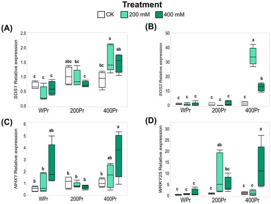 Relative expression levels of CmSOS1 (A), CmSOS2 (B), CmNHX1 (C), and CmWRKY25 (D) in shoots of C. maritima plants grown from non-primed (NPr) and primed seeds (WPr, 200Pr, 400Pr) under different NaCl treatments (CK, 200 mM, and 400 mM NaCl) for 7 days. Values are presented as the mean ± SE (n = 6). Different letters indicate significant differences (Tukey test, p < 0.05).