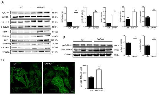 Key factors involved in cardiac hypertrophy. (A) Western blots of GATA4, Nkx-2.5, MyH7, cMyH, and α-actinin proteins derived from WT or GAP-43−/− cardiomyocytes, and the corresponding densitometric analyses. (B) Western blotting of p-CaMKII and Met281/282 oxidized CaMKII (ox-CaMKII) proteins from WT or GAP-43−/− cardiomyocytes and the corresponding densitometric analyses. The densitometric analyses in (A,B) are plotted as the ratio between the optical density (OD) × mm2 of each band and the OD × mm2 of the corresponding loading control (GAPDH, β-tubulin, Vinculin, and CaMKII). (C) Representative images of WT and GAP-43−/− cardiomyocytes stained for α-actinin and quantitative analyses of cell area (Bar = 20 µm). Data are expressed as means ± S.E.M. from N = three biological samples in panels (A–C) with n = 143 WT and 147 GAP-43−/− cardiomyocytes in panel (C). * p < 0.05; *** p < 0.001 (Student’s t-test).
