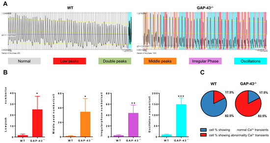Ca2+ transient abnormalities. (A) Representative Ca2+ signal abnormality patterns detected by AnomalyExplorer software (ver. 1.0) [15] in WT (left image) and GAP-43−/− (right image) cardiomyocytes loaded with Fluo-4. Each color-coded represents both normal Ca2+ signals (in gray) and different abnormalities such as low peaks, double peaks, medium peaks, oscillations, and irregular phases. (B) Quantitative analysis of the different Ca2+ transient abnormalities. The values are means ± S.E.M. from N = three biological samples; a total number of 251 WT and 318 GAP-43−/− cardiomyocytes were examined * p < 0.05, ** p < 0.01, *** p < 0.001 (Students’ t-tests). (C) Pie charts indicate the cell percentages showing different Ca2+ transient signals.