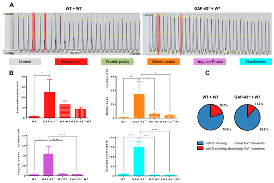 CaM inhibitor restored Ca2+ dyshomeostasis in GAP-43−/− cardiomyocytes. (A) Representative Ca2+ signal abnormality patterns detected by AnomalyExplorer software [15] in WT (left image) and GAP-43−/− (right image) cardiomyocytes loaded with Fluo-4 and treated with 20 μM W7, a CaM inhibitor. Each color-coded chart represents both normal Ca2+ signals (in gray) and different abnormalities such as low peaks, double peaks, medium peaks, oscillations, and irregular phases. (B) Quantitative analysis of the different Ca2+ transient abnormalities. The values are means ± S.E.M. from N = three biological samples; a total of 1589 WT+W7 and 1547 GAP-43−/−+W7 cardiomyocytes were examined (the data related to WT and GAP-43−/− cardiomyocytes are those shown in Figure 2). * p < 0.05, ** p < 0.01, **** p < 0.0001 (ANOVA with post-hoc Tukey’s multiple comparison test). (C) Pie charts indicate the cell percentage showing different Ca2+ transient signals.