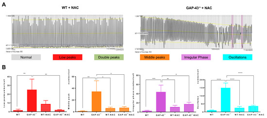 Impact of the antioxidant NAC on spontaneous Ca2+ oscillations in GAP-43−/− cardiomyocytes. (A) Representative Ca2+ signal abnormality patterns detected by AnomalyExplorer software [15] in WT (left image) and GAP-43−/− (right image) cardiomyocytes loaded with Fluo-4 and treated with 1 mM NAC, a pharmacological antioxidant. Each color-coded chart represents both normal Ca2+ signals (in gray) and different abnormalities such as low peaks, double peaks, medium peaks, oscillations, and irregular phases. (B) Quantitative analysis of the different Ca2+ transient abnormalities. The values are means ± S.E.M. from N = three biological samples, a total number of 739 WT+NAC and 681 GAP-43−/− + NAC cardiomyocytes were examined (the data related to WT and GAP-43−/− cardiomyocytes are those shown in Figure 2). * p < 0.05, ** p < 0.01, *** p < 0.001, **** p < 0.0001 (ANOVA with post-hoc Tukey’s multiple comparison test).
