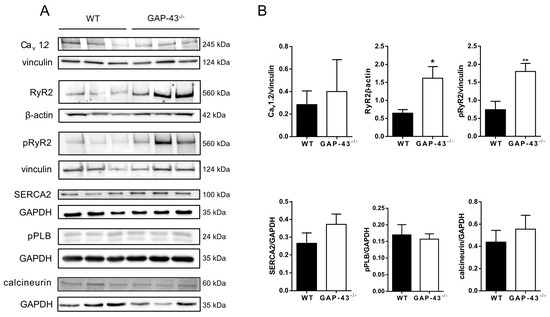 In GAP-43−/− cardiomyocytes, we observed a slight, although not significant, increase in the expression of the voltage-dependent Ca2+ channel Cav1.2, while the expression of ryanodine receptor type 2 (RyR2) and its phosphorylated form (pRyR2) was significantly increased (Figure 5B). The expression levels of the sarcoplasmic reticulum Ca2+-ATP pump type 2 (SERCA2), of the phosphorylated form of phospholamban (pPLB), an intracellular regulator of SERCA2, and of the calcineurin, a Ca2+-activated protein phosphatase involved in the regulation of many cardiac functions, did not change in GAP-43−/− cardiomyocytes in respect to WT ones (Figure 5B).