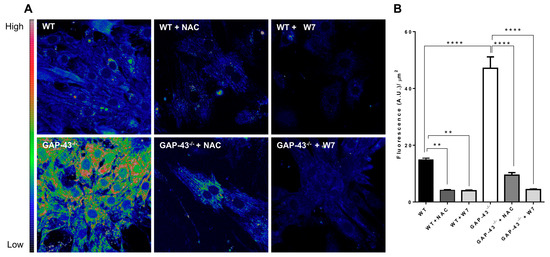 Given the crosstalk between Ca2+ homeostasis and oxidative stress, ROS levels were assayed using a specific dye (H2DCF-DA) and confocal microscopy. The results showed that ROS levels were about three-fold greater in GAP-43−/− cardiomyocytes compared to WT ones (Figure 4A,B). As expected, the administration of the antioxidant NAC (1 mM) decreased ROS levels. In the presence of the specific inhibitor of CaM (20 µM W7), ROS levels were strongly reduced in GAP-43−/− cardiomyocytes. To note, we also observed a significant reduction in ROS levels in WT cardiomyocytes treated with W7 or NAC (Figure 6A,B).
