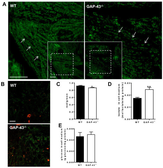 Mitochondria morphology and metabolism changes in GAP-43−/− cardiomyocytes. (A) Representative high-magnification confocal images (corresponding to insert dotted-line boxes) of mitochondria in WT and GAP-43−/− cardiomyocytes immunostained with anti-TOM20 (bar = 20 µm; the insert solid-line boxes show the low magnification acquired field). The white arrows indicate the different mitochondria morphology in WT and in GAP-43−/− cardiomyocytes. (B) Representative confocal images of JC-1-stained mitochondria in WT and GAP-43−/− cardiomyocytes (bar = 20 µm). (C) Mitochondrial membrane potential in WT and GAP-43−/− cardiomyocytes loaded with JC-1, plotted as the ratio of red and green fluorescence of JC-1. Data are means ± S.E.M. from N = three biological samples; a total number of 523 WT and 681 GAP-43−/− cardiomyocytes were examined. (D) Lactate released in cardiomyocyte cell medium. (E) Glucose levels in cardiomyocyte cell medium. Data in panels (D,E) are means ± S.E.M. from N = six biological samples of WT cardiomyocyte cultures and from five biological samples of GAP-43−/− cardiomyocyte cultures. * p < 0.05; ** p < 0.01 (Student’s t-tests).