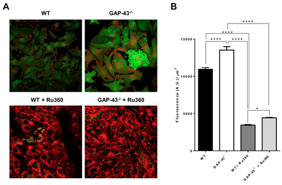 To find the cause of the morphological and functional alterations in mitochondria, considering the results on Ca2+ homeostasis reported above, we analyzed the Ca2+ content in mitochondria by using confocal microscopy and two dyes, Fluo-4 and MitoTracker Deep Red, to highlight Ca2+ levels in the mitochondrial area. Compared to WT cardiomyocytes, the GAP-43−/− ones showed an increase in mitochondrial Ca2+ levels, abolished by Ru360, a specific inhibitor of mitochondrial Ca2+ uniporter (MCU), which allows Ca2+ entry into mitochondria (Figure 8A,B).