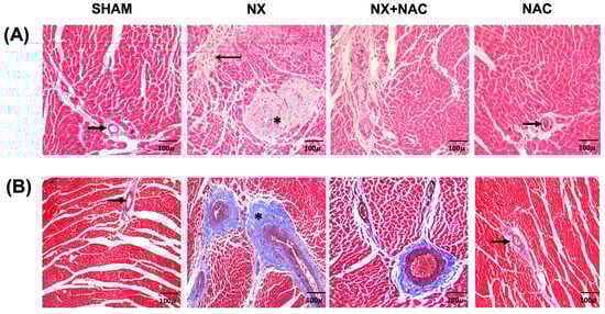 Histological evaluation with H&E and Masson’s trichrome stainings were conducted to study cardiac structure alterations such as remodeling. The results showed significant abnormalities in the cardiac tissue of the NX group compared to that of the SHAM manifested by considerable widening of the medium arterial layer by fibrosis, which substantially decreased the vascular lumen; this perivascular fibrosis highly extended and substituted the neighbor cardiac muscular tissue (Figure 4A). As expected, the percentage of the fibrotic area in the myocardium was significantly increased in the LV of the NX group (16.22%) compared to that of the SHAM group (0.4%). Notably, the NX + NAC group significantly decreased this parameter (6.35%) (Figure 4B,C). Plasma troponin T (TnT) is a systemic marker for evaluating cardiac dysfunction [47]. Therefore, we performed the immunodetection of TnT in the plasma of animals at 8 weeks after NX. As shown in Figure 4D,E, the TnT protein levels significantly increased (p < 0.01) in the plasma of animals of the NX group compared to that of the SHAM group, but it partially decreased in the NX + NAC animals (p = 0.946). This result showed that NAC exerted partial protection during CKD, possibly as previously reported, by reducing systemic inflammatory events and hemodynamic changes [48,49]. Because cardiorenal damage is highly promoted by persistent inflammation [25], we evaluated the proinflammatory cytokine interleukin-1β (IL-1β) in the LV of the heart. As shown in Figure 4D,F, the levels of IL-1β notably increased in the heart of the NX group compared to that of the SHAM group without significant changes (p = 0.30). Interestingly, IL-1β levels decreased further in the NX + NAC group treated with NAC (p = 0.07), suggesting a cardiac anti-inflammatory effect promoted by NAC.