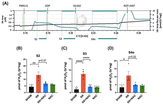 To investigate whether NAC prevented mitochondrial bioenergetic alterations through the modulation of the redox balance, we evaluated the mitochondrial H2O2 production rate (Figure 7A). Mitochondria isolated from the hearts of animals with NX showed higher rates of H2O2 production in states S2, S3, and S4o compared to the SHAM group (Figure 7B–D). The levels of H2O2 production were reduced in S2, S3, and S4o in the NX + NAC group. However, the reduction was only significant in S3, indicating that NAC can act as an antioxidant that regulates the redox state in the mitochondria during CRS-4 development.
