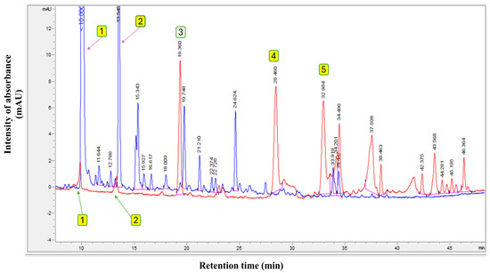 Polyphenol profile of unsupplemented extra virgin olive oil (Control) (blue chromatogram) and supplemented extra virgin olive oil with olive fruit extract (red chromatogram). Where (1): Hydroxytyrosol; (2): Tyrosol; (3): Internal standard (syringic acid); (4): Oleuropein; and (5): Oleocanthal.