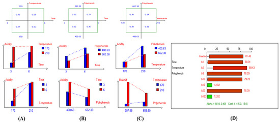 Two-way table illustrating the joined relations between the independent variables and the dependent variable (acidity%) in EVOO Royuela under D–F: (A) Time and Temperature, (B) Time and Polyphenols, (C) Temperature and Polyphenols, and (D) Results showing the significant impact of each independent variable and the interactions among the experimental variables on acidity; b signifies a significant change when be >b123, while b signifies no significant change when be ≤b123; b1, b2, b3 are the main effects of the independent variables, while b12, b13, b23, and b123 represent the interaction effects of the independent variables in the experimental design of the D–F process.