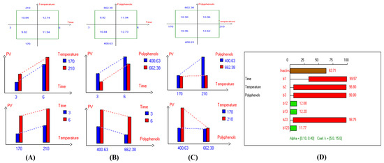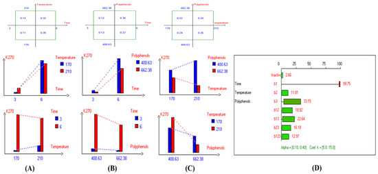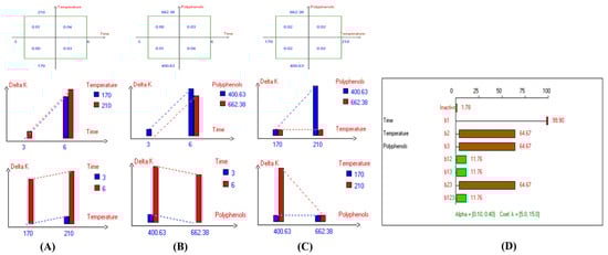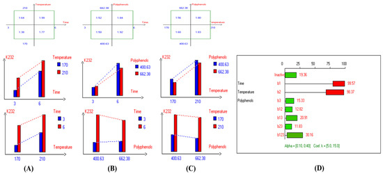 Two-way table illustrating the joined relations between the independent variables and the dependent variable (∆K) in EVOO Royuela under D–F: (A) Time and Temperature, (B) Time and Polyphenols, (C) Temperature and Polyphenols, and (D) Results showing the significant impact of each independent variable and the interactions among combined independent variables on ∆K; b signifies a significant change when be >b123, while b signifies no significant change when be ≤b123; b1, b2, b3 are the main effects of the independent variables, while b12, b13, b23, and b123 represent the interaction effects of the independent variables in the experimental design of the D–F process.