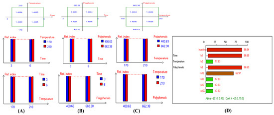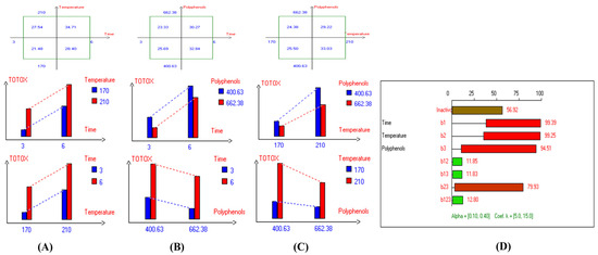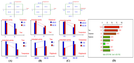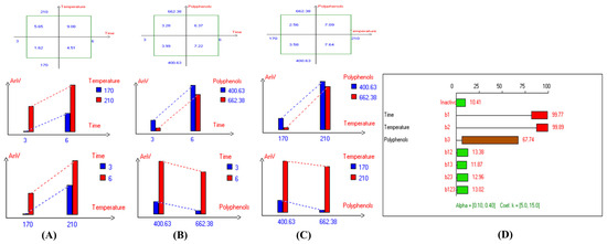 Two-way table illustrating the joined relations between the independent variables and the dependent variable (antioxidant activity %) in EVOO Royuela under D–F: (A) Time and Temperature, (B) Time and Polyphenols, (C) Temperature and Polyphenols, and (D) Results showing the significant impact of each independent variable and the interactions among combined independent variables on antioxidant activity; b signifies a significant change when be >b123, while b signifies no significant change when be ≤b123; b1, b2, b3 are the main effects of the independent variables, while b12, b13, b23, and b123 represent the interaction effects of the independent variables in the experimental design of the D–F process.
