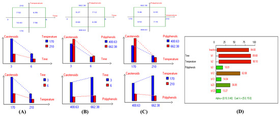 Two-way table illustrating the joined relations between the independent variables and the dependent variable (carotenoids (mg/kg)) in EVOO Royuela under D–F: (A) Time and Temperature, (B) Time and Polyphenols, (C) Temperature and Polyphenols, and (D) Results showing the significant impact of each independent variable and the interactions among combined independent variables on carotenoids; b signifies a significant change when be >b123, while b signifies no significant change when be ≤b123; b1, b2, b3 are the main effects of the independent variables, while b12, b13, b23, and b123 represent the interaction effects of the independent variables in the experimental design of the D–F process.