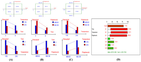 Two-way table illustrating the joined relations between the independent variables and the dependent variable (chlorophyll (mg/kg)) in EVOO Royuela under D–F: (A) Time and Temperature, (B) Time and Polyphenols, (C) Temperature and Polyphenols, and (D) Results showing the significant impact of each independent variable and the interactions among combined independent variables on chlorophyll; b signifies a significant change when be >b123, while b signifies no significant change when be ≤b123; b1, b2, b3 are the main effects of the independent variables, while b12, b13, b23, and b123 represent the interaction effects of the independent variables in the experimental design of the D–F process.