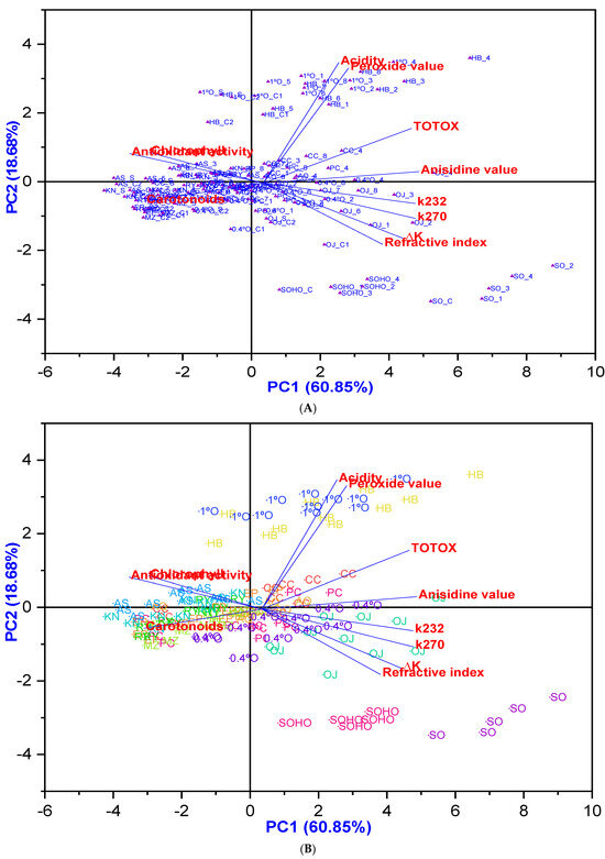 (A) PCA biplot (combining score and loading plots) of nine EVOO varieties, compared with various refined olive oils blended with EVOO or VOO, sunflower oil, and high oleic sunflower oil, illustrating the potential clustering of oil samples based on physicochemical and antioxidant activity changes under various deep-frying conditions as well as before the deep-frying. (B) PCA clustering analysis based on different oil categories: The PCA clustering analysis categorizes different oils based on their response variables, including acidity, K232, K270, ∆K, peroxide value (PV), anisidine value (AnV), TOTOX, refractive index (RI), carotenoids, chlorophyll, and antioxidant activity. Each category is represented in a distinct color, allowing for clear differentiation. The oil categories include Picual (PC), Cornicabra (CC), Empeltre (EP), Arbequina (AQ), Hojiblanca (HB), Manzanilla Cacereña (MZ), Royuela/Arróniz (RY), Koroneiki (KN), Arbosana (AS), Olive oil 1° (1°O), Pomace olive oil (or Orujo) (OJ), Olive oil 0.4° (0.4°), sunflower oil (SO), and high oleic sunflower oil (SOHO). Where PC_C1: Picual_Control 1; PC_S: Picual_Supplemented; PC_C2: Picual_Control 2; PC_1: Picual_Exp 1; PC_2: Picual_Exp 2; PC_3: Picual_Exp 3; PC_4: Picual_Exp 4; PC_5: Picual_Exp 5; PC_6: Picual_Exp 6; PC_7: Picual_Exp 7; PC_8: Picual_Exp 8; CC_C1: Cornicabra_Control 1; CC_S: Cornicabra_Supplemented; CC_C2: Cornicabra_Control 2; CC_1: Cornicabra_Exp 1; CC_2: Cornicabra_Exp 2; CC_3: Cornicabra_Exp 3; CC_4: Cornicabra_Exp 4; CC_5: Cornicabra_Exp 5; CC_6: Cornicabra_Exp 6; CC_7: Cornicabra_Exp 7; CC_8: Cornicabra_Exp 8; EP_C1: Empeltre_Control 1; EP_S: Empeltre_Supplemented; EP_C2: Empeltre_ Control 2; EP_1: Empeltre_Exp 1; EP_2: Empeltre_Exp 2; EP_3: Empeltre_Exp 3; EP_4: Empeltre_Exp 4; EP_5: Empeltre_Exp 5; EP_6: Empeltre_Exp 6; EP_7: Empeltre_Exp 7; EP_8: Empeltre_Exp 8; AQ_C1: Arbequina_Control 1; AQ_S: Arbequina_Supplemented; AQ_C2: Arbequina_ Control 2; AQ_1: Arbequina_Exp 1; AQ_2: Arbequina_Exp 2; AQ_3: Arbequina_Exp 3; AQ_4: Arbequina_Exp 4; AQ_5: Arbequina_Exp 5; AQ_6: Arbequina_Exp 6; AQ_7: Arbequina_Exp 7; AQ_8: Arbequina_Exp 8; HB_C1: Hojiblanca_Control 1; Hojiblanca_Supplemented; Hojiblanca_Control 2; HB_1: Hojiblanca_Exp 1; HB_2: Hojiblanca_Exp 2; HB_3: Hojiblanca_Exp 3; HB_4: Hojiblanca_Exp 4; HB_5: Hojiblanca_Exp 5; HB_6: Hojiblanca_Exp 6; HB_7: Hojiblanca_Exp 7; HB_8: Hojiblanca_Exp 8; MZ_C1: Manzanilla_ Control 1; MZ_S: Manzanilla_Supplemented; MZ_C2: Manzanilla_Control 2; MZ_1: Manzanilla_Exp 1; MZ_2: Manzanilla_Exp 2; MZ_3: Manzanilla_Exp 3; MZ_4: Manzanilla_Exp 4; MZ_5: Manzanilla_Exp 5; MZ_6: Manzanilla_Exp 6; MZ_7: Manzanilla_Exp 7; MZ_8: Manzanilla_Exp 8; RY_C1: Royuela_ Control 1; RY_S: Royuela_Supplemented; RY_C2: Royuela_ Control 2; RY_1: Royuela_Exp 1; RY_2: Royuela_Exp 2; RY_3: Royuela_Exp 3; RY_4: Royuela_Exp 4; RY_5: Royuela_Exp 5; RY_6: Royuela_Exp 6; RY_7: Royuela_Exp 7; RY_8: Royuela_Exp 8; OJ_C1: Pomace_Control 1; OJ_S: Pomace_ Supplemented; OJ_C2: Pomace_ Control 2; OJ_1: Pomace_Exp 1; OJ_2: Pomace_Exp 2; OJ_3: Pomace_Exp 3; OJ_4: Pomace_Exp 4; OJ_5: Pomace_Exp 5; OJ_6: Pomace_Exp 6; OJ_7: Pomace_Exp 7; OJ_8: Pomace_Exp 8; KN_C1: Koroneiki_Control 1; KN_S: Koroneiki_Supplemented; KN_C2: Koroneiki_Control 2; KN_1: Koroneiki_Exp 1; KN_2: Koroneiki_Exp 2; KN_3: Koroneiki_Exp 3; KN_4: Koroneiki_Exp 4; KN_5: Koroneiki_Exp 5; KN_6: Koroneiki_Exp 6; KN_7: Koroneiki_Exp 7; KN_8: Koroneiki_Exp 8; AS_C1: Arbosana_Control 1; AS_S: Arbosana_Supplemented; AS_C2: Arbosana_Control 2; AS_1: Arbosana_Exp 1; AS_2: Arbosana_Exp 2; AS_3: Arbosana_Exp 3; AS_4: Arbosana_Exp 4; AS_5: Arbosana_Exp 5; AS_6: Arbosana_Exp 6; AS_7: Arbosana_Exp 7; AS_8: Arbosana_Exp 8; 1°O_C1: Olive 1°_ Control 1; 1°O_S: Olive 1°_Supplemented; 1°O_C2: Olive 1°_ Control 2; 1°O_1: Olive 1°_Exp 1; 1°O_2: Olive 1°_Exp 2; 1°O_3: Olive 1°_Exp 3; 1°O_4: Olive 1°_Exp 4; 1°O_5: Olive 1°_Exp 5; 1°O_6: Olive 1°_Exp 6; 1°O_7: Olive 1°_Exp 7; 1°O_8: Olive 1°_Exp 8; 0.4°O_C1: Olive 0.4°_ Control 1; 0.4°O_S: Olive 0.4°_Supplemented; 0.4°O_C2: Olive 0.4°_ Control 2; 0.4°O_1: Olive 0.4°_Exp 1; 0.4°O_2: Olive 0.4°_Exp 2; 0.4°O_3: Olive 0.4°_Exp 3; 0.4°O_4: Olive 0.4°_Exp 4; 0.4°O_5: Olive 0.4°_Exp 5; 0.4°O_6: Olive 0.4°_Exp 6; 0.4°O_7: Olive 0.4°_Exp 7; 0.4°O_8: Olive 0.4°_Exp 8; SO_C: Sunflower oil_Control; SO_1: Sunflower oil_Exp 1; SO_2: Sunflower oil_Exp 2; SO_3: Sunflower oil_Exp 3; SO_4: Sunflower oil_Exp 4; SOHO_C: Sunflower oil_high oleic acid_Control; SOHO_1: Sunflower oil_ high oleic acid _Exp 1; SOHO_2: Sunflower oil_ high oleic acid_Exp 2; SOHO_3: Sunflower oil_ high oleic acid_Exp 3; SOHO_4: Sunflower oil_ high oleic acid_Exp 4. In addition, for the olive oil categories, Control 1 (used as the control for Experiments 1–4) refers to original, non-deep-fried olive oil. Supplemented oil refers to non-deep-fried olive oil that has been enriched with olive fruit extract, which is also used in the preparation of Control 2. Control 2 (used as the control for Experiments 5–8) is a mixture of Control 1 and the supplemented oil, resulting in a total polyphenol content of up to 650 mg/kg. Exp.1: olive oil deep-fried at 170 °C for 3 h without polyphenol supplementation, Exp.2: olive oil deep-fried at 170 °C for 6 h without polyphenol supplementation, Exp.3: olive oil deep-fried at 210 °C for 3 h without polyphenol supplementation, Exp.4: olive oil deep-fried at 210 °C for 6 h without polyphenol supplementation, Exp.5: olive oil deep-fried at 170 °C for 3 h with polyphenol supplementation, Exp.6: olive oil deep-fried at 170 °C for 6 h with polyphenol supplementation, Exp.7: olive oil deep-fried at 210 °C for 3 h with polyphenol supplementation, Exp.8: olive oil deep-fried at 210 °C for 6 h with polyphenol supplementation. Moreover, for sunflower oil categories: Control refers to original, non-deep-fried oil. Exp.1: oil deep-fried at 170 °C for 3 h, Exp.2: oil deep-fried at 170 °C for