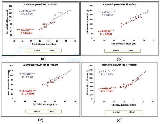 As can be observed in Figure 1, the variant to which the commercial feed was administered (CF) registered a negative allometric growth (b < 3), and even a decrease in the “b” coefficient was highlighted by the end of the experimental period (b = 2.1747). The same trend was observed for the BIF and IF variants. The best performance in terms of fish allometric growth was obtained in the case of the TIF variant, in which positive allometry was observed (b > 3; b = 3.0578) (Figure 1). Monitoring the allometric factor is important for optimizing the feeding strategy by adjusting nutrient intake according to the fish growth pattern [].