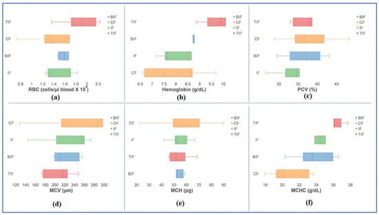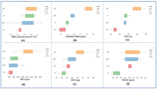 The red blood cell count (RBCc—cells/μL blood × 106) was performed using a hemocytometer and Vulpian solution. The hemoglobin concentration (Hb—g/dL) was determined using Drabkin’s reagent and measured at 540 nm with a UV-VIS spectrometer. The hematocrit (PVC—%) was determined by using the centrifugation technique []. The erythrocyte constants (mean corpuscular volume (MCV—µm3), mean corpuscular hemoglobin (MCH—pg), and mean corpuscular hemoglobin concentration (MCHC—g/dL)) were calculated using a standard equation based on RBCc, Hb, and PVC, as described by Svobodova et al. [] and Ispir et al. [].
