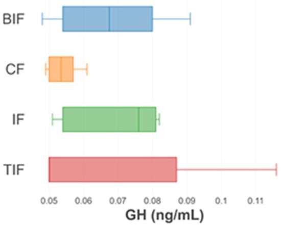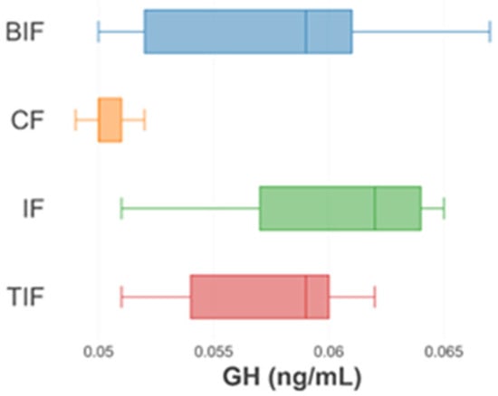 The blood biochemical indicators were measured from the blood plasma; thus, the blood samples were centrifugated, followed by the separation of the plasma from the blood cells. The analyzed biochemical parameters were as follows: albumin (g/dL), alkaline phosphatase (ALPs—U/L), alanine aminotransferase (TGP—U/L), aspartate aminotransferase (TGO—U/L), amylase (U/L), calcium (Ca—mg/dL), cholesterol (mg/dL), HDL-cholesterol (HDL—mg/dL), creatinine (mg/dL), lactate dehydrogenase (LDH—U/L), lipase (U/L), total bilirubin (TB—mg/dL), total protein (TP—g/dL), triglycerides (mg/dL), urea (mg/dL), and growth hormone (GH—mg/mL). All biochemical indicators were measured spectrophotometrically (colorimetric method) using commercial kits from Bionik (Tehran, Iran).