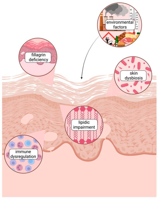 Even more important is the role of an impaired skin barrier in increasing sensitivity to environmental factors, triggering frequent flare-ups of the disease. Exposure to environmental pollutants, such as fine particulate matter from vehicle emissions and industrial activities and the gaseous pollutants (NO2 and SO2) commonly found in urban environments, as well as seasonal climate variations, is indeed associated with the worsening of AD symptoms [,]. Extremes in temperature and humidity can also adversely affect the skin barrier. Low humidity and cold temperatures often lead to increased skin dryness and irritation, whereas high humidity and heat can induce sweating, which may irritate the skin and trigger flare-ups [] (Figure 1).