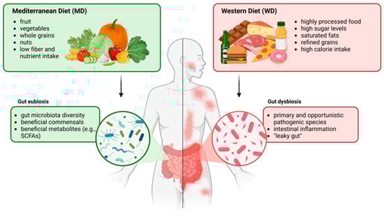 A WD dietary pattern is associated with increased risks of chronic diseases, including obesity, type 2 diabetes, cardiovascular diseases, and certain cancers [,,,,]. In contrast, the polyphenols contained in the plant-based foods typical of the MD have a range of health benefits, including anti-inflammatory, antioxidant, neuroprotective, and anti-cancer properties [,]. Both the MD and WD impact the gut microbiota, supporting eubiosis and promoting dysbiosis, respectively (Figure 2) [].