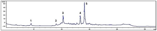 Chromatogram of M. rupestris phenolics at 280 nm. The numbers on the peaks of the chromatogram indicate the individual phenolic compounds: 1. Gallic acid; 2. Catechin; 3. Syringic acid; 4. Quercetin; 5. p-Coumaric acid.