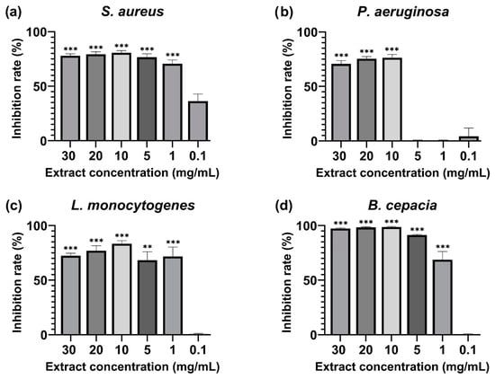Percentage of 50% biofilm inhibition of (a) Staphylococcus aureus ATCC 25923, (b) Pseudomonas aeruginosa ATCC 9027, (c) Listeria monocytogenes ATCC 13,932, and (d) Burkholderia cepacia ATCC 25,416 after 24 h incubation with M. rupestris extract at a 30–0.1 mg/mL concentration. Treatments at different concentrations were compared with a 50% theoretical inhibition standard for statistical significance using a two-way ANOVA test. All the values are mean ± SD, p-value (**) < 0.01, (***) < 0.001.