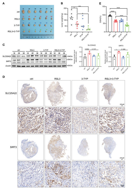 SIRT3 protects LUAD from RSL3-induced ferroptosis in vivo. (A) After a week of acclimation, 6-week-old immunodeficient nude mice were randomly divided into four groups (six mice per group). Tumor models were established by subcutaneously injecting A549 cells (5 × 106 cells per mouse). When the tumor volume reached 100 mm3, intratumoral injections were administered as follows: DMSO, RSL3 (40 mg/kg), 3-TYP (40 mg/kg), or a combination of RSL3 (40 mg/kg) and 3-TYP (40 mg/kg). The injections were performed every 3 days for a total of three treatments. After the completion of treatment, the mice were sacrificed, and the tumors were excised, weighed, and photographed. 3-TYP + RSL3 significantly impeded the growth of LUAD in xenograft mice compared to the control and RSL3 groups. (B) Quantitative analysis of tumor weight revealed significant differences among the control, RSL3, 3-TYP, and RSL3 + 3-TYP treatment groups. (C) Western blotting was used to detect the expression of SLC25A22 and SIRT3 proteins in tumor tissues from the DMSO control group, RSL3-treated group, 3-TYP-treated group, and the combinatory treatment group (left). Relative quantification of band intensities was also performed (right). (D) Immunohistochemistry assay was used to evaluate the expression of SLC25A22 and SIRT3 proteins in tumor tissues from the DMSO control group, RSL3-treated group, 3-TYP-treated group, and the combinatory treatment group. (E) GSH levels were measured in tumor tissues from the DMSO control group, RSL3-treated group, 3-TYP-treated group, and the combination treatment group. * p < 0.05, *** p < 0.001, **** p < 0.0001.