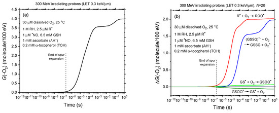 Water is the primary component in living cells and tissues by weight, making an understanding of water radiolysis essential for comprehending radiobiological effects. Quantitatively, the main products of the radiolysis of pure deaerated water include hydrated electrons (e−aq), hydrogen atoms (H●), molecular hydrogen (H2), hydroxyl radicals (●OH), hydrogen peroxide (H2O2), hydronium ions (H3O+), and hydroxide ions (OH−) (see, e.g., [56,57,58,59]). These products initially form within a nonhomogeneous track structure where ●OH and e−aq radicals are most abundant. Under aerated conditions, e−aq and H● atoms quickly (within microseconds) convert to superoxide/hydroperoxyl radicals (O2●−/HO2●), with O2●− in pH-dependent equilibrium with its conjugate acid (pKa ≈ 4.8 at 25 °C) [60]. As a result, at physiological pH, the main reactive species when homogeneity is achieved are O2●−, ●OH, and H2O2. H2 plays only a minor role in the radiolysis of aqueous solutions, with most of it escaping from the solution.