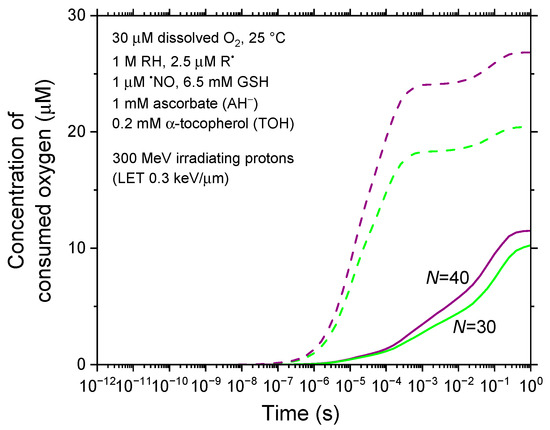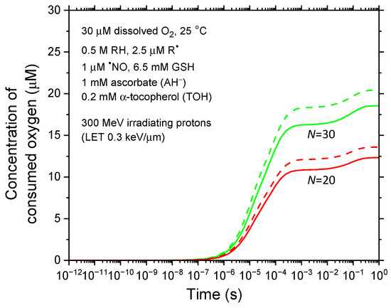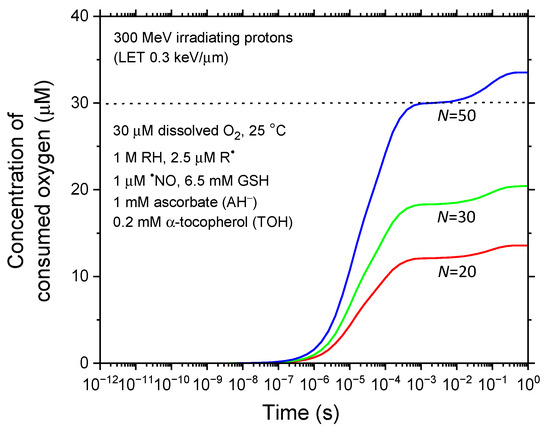 In cellular environments, the situation is markedly different. Firstly, while reactions involving e−aq and H● with O2 are prominent in pure, aerated water radiolysis, they are much less frequent in cells. This reduction is largely due to the high concentration of intracellular bio-organic molecules (collectively referred to as RH), such as DNA, proteins, and lipids [47,61,62,63], which effectively compete with O2 for the capture of these species [40,47,62,63,64,65,66,67]. For instance, the scavenging power for the reaction of e−aq with these biomolecules is estimated to be 3.4 × 108 s−1 [61], nearly 1000 times greater than that for 30 μM oxygen—a typical concentration in most normal tissues [56]—estimated at 5.7 × 105 s−1. Here, “scavenging power” refers to the product of the scavenger’s concentration and its reaction rate constant with e−aq. This notable difference in scavenging power between cellular components and oxygen within cells was underscored by Wardman [64] and Favaudon et al. [47], and further substantiated through Monte Carlo multi-track chemistry simulations by Sultana et al. [68]. This challenges the previous model of treating a cell merely as a “bag” of pure, aerated water (see, e.g., [69,70,71,72,73]). Indeed, during FLASH irradiation, the temporary depletion of O2 by e−aq/H● is very low in a cellular or tissue environment.