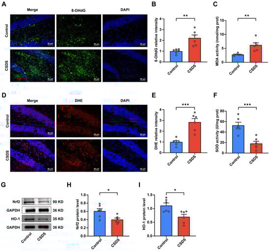 Overactivated oxidative stress in the hippocampus after CSDS exposure. (A,B) Representative images of 8-OHdG staining (green) and quantification of relative fluorescent intensity (n = 6 per group). Nuclei (blue) are stained with DAPI. Scale bar is 50 μm. (C) Activity of MDA in the hippocampus (n = 6 per group). (D,E) Representative images of DHE staining (red) and quantification of relative fluorescent intensity (n = 6 per group). Nuclei (blue) are stained with DAPI. Scale bar is 50 μm. (F) Activity of SOD in the hippocampus (n = 6 per group). (G–I) The protein expression of Nrf2 (H), HO-1 (I) (n = 6 per group). Parallel gels were used to analyze the expression levels of HO-1. Data are expressed as the means ± SEMs. * p < 0.05, ** p < 0.01, and *** p < 0.001 compared to Control, analyzed using a two-tailed, unpaired Student’s t-test. For detailed statistical data, see in Supplementary Table S1.