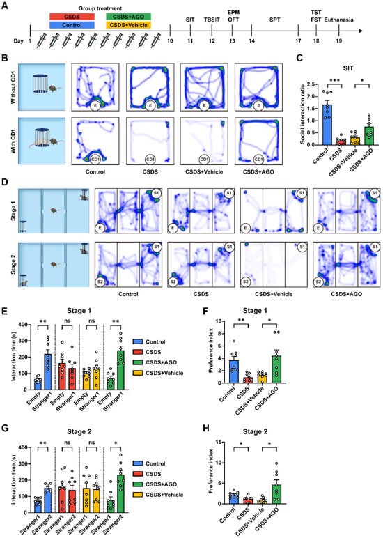 The Social Interaction Test (SIT) was conducted in two phases. In the initial phase, experimental mice were exposed to an open-field arena (40 cm × 40 cm × 40 cm) containing an empty wire-mesh cage (10 cm × 7 cm × 18 cm) for 2.5 min. In the second phase, the same mice were reintroduced to the arena for another 2.5 min, this time with a novel and aggressive CD-1 mouse confined within the wire-mesh cage. The time spent by the experimental mice in the interaction zone around the wire-mesh cage was recorded and analyzed using TopScan software 3.00 (CleverSys Inc., Reston, VA, USA). The social interaction (SI) ratio was calculated as [time spent in the interaction zone with the CD-1 mouse/time spent in the interaction zone without the CD-1 mouse]. Mice with an SI ratio less than 1 were classified as susceptible, while those with an SI ratio greater than 1 were classified as resilient. All mice used in the experiment were categorized as susceptible. To prevent cross-contamination between tests, both the open field arena and the wire-mesh cage were thoroughly cleaned with 75% alcohol after each trial. In the first experiment, the SIT was performed on 12 mice (N = 6 per group: Control, CSDS). In the second experiment, 32 mice (n = 8 per group: Control, CSDS, CSDS + Vehicle, CSDS + AGO) were assessed.