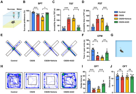 The elevated plus maze (EPM) test was utilized to assess anxiety-related behaviors in experimental animals. The apparatus comprised two enclosed arms (30 cm × 6 cm × 15 cm) and two open arms (30 cm × 6 cm). Each mouse was individually positioned on the central platform, which was oriented towards one of the open arms. The mice were permitted to explore the EPM apparatus for a duration of 5 min, during which the time spent in both the enclosed and open arms was recorded using TopScan software. Following each trial, the cross maze was sanitized with 75% ethanol to maintain a standardized testing environment. In the first experiment, the EPM was conducted on 12 mice (N = 6 per group: Control, CSDS). In the second experiment, 32 mice (n = 8 per group: Control, CSDS, CSDS + Vehicle, CSDS + AGO) were evaluated.