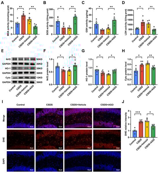 Agomelatine treatment suppressed oxidative stress in hippocampus of CSDS-exposed mice. (A–D) Activities of MDA (A), SOD (B), GSH (C), and LDH (D) in the hippocampus (n = 6 per group). (E–H) The protein expression of Nrf2 (F), HO-1 (G), and Cytc (H) in the hippocampus (n = 6 per group). Parallel gels were used to analyze the expression levels of HO-1. (I,J) Representative images of DHE staining (red) and quantification of relative fluorescent intensity (n = 6 per group). Nuclei are stained with DAPI (blue). Scale bar is 50 μm. Data are presented as the means ± SEMs. * p < 0.05, ** p < 0.01, *** p < 0.001. Statistical analyses were performed using one-way ANOVA followed by Dunnett’s T3 post hoc test for comparisons between the control and CSDS groups or CSDS + Vehicle and CSDS + AGO groups. For detailed statistical data, see in Supplementary Table S1.