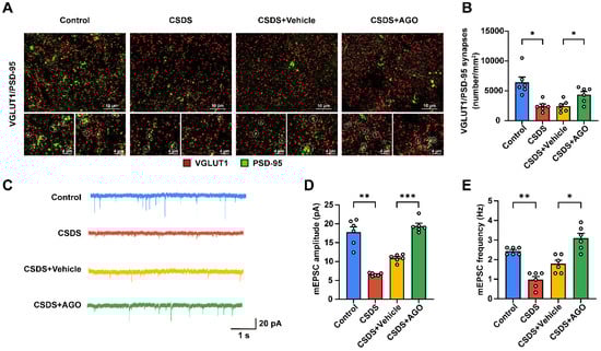 Agomelatine treatment improved synaptic injury in the hippocampi of CSDS-exposed mice. (A,B) Representative images of dual immunofluorescence staining of VGLUT1 (red) and PSD-95 (green) and quantification of the number of colocalized VGLUT1 and PSD-95 puncta (n = 6 per group). (C–E) Representative raw traces (C), amplitude (D), and frequency (E) of mEPSCs (n = 6 from 3 cells per group). Data are expressed as the means ± SEMs. * p < 0.05, ** p < 0.01, *** p < 0.001. Statistical comparisons of quantification of VGLUT1 and PSD-95 colocalization as well as mEPSC amplitude were conducted using one-way ANOVA followed by Dunnett’s T3 post hoc test (B,D) or a non-parametric test (E) between the control and CSDS groups or CSDS + Vehicle and CSDS + Ago groups. For detailed statistical data, see in Supplementary Table S1.