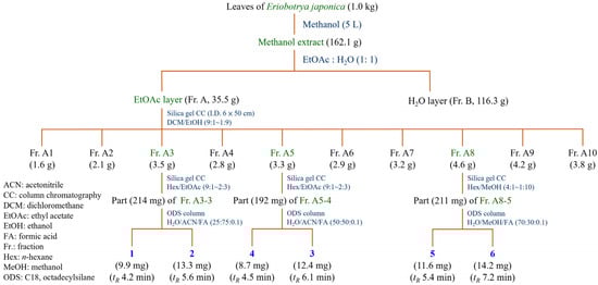 The leaves of Eriobotrya japonica (1.0 kg) were soaked in 5 L of 100% methanol for 72 h at room temperature, with intermittent stirring. The extracted solution was filtered and concentrated at 38 °C under reduced pressure to obtain the dried crude extract (162.1 g) (Figure 1). The crude methanol extract was resuspended in water and sequentially partitioned with EtOAc (ethyl acetate) to obtain two fractions, including EtOAc fraction (Fr. A, 35.5 g) and water fraction (Fr. B, 116.3 g). Fr. A (35.5 g) was further separated by silica gel column chromatography (I.D. 6 × 50 cm; CH2Cl2/EtOH gradient) to afford 10 subfractions (Fr. A1–A10). The Fr. A3 (3.5 g) was subjected to silica gel column chromatography (n-hexane/EtOAc 9:1–2:3) to give 6 fractions (Fr. A3-1–A3-6). The reversed-phase HPLC separation system was used for further purification using a mobile phase consisting of 0.1% formic acid (FA) aqueous solution (H2O) (v/v) and acetonitrile (ACN). Part (164 mg) of Fr. A3-3 was further purified by ODS column (H2O/ACN/FA 25:75:0.1) to obtain compounds 1 (17.9 mg, tR = 4.2 min) and 2 (24.3 mg, tR = 5.6 min). The Fr. A5 (3.3 g) was subjected to silica gel column chromatography (n-hexane/EtOAc 9:1–2:3) to give 6 fractions (Fr. A5-1–A5-6). Part (142 mg) of Fr. A5-4 was further purified by ODS column (H2O/ACN/FA 50:50:0.1) to obtain compounds 4 (12.7 mg, tR = 4.5 min) and 3 (20.4 mg, tR = 6.1 min). The Fr. A8 (4.6 g) was subjected to silica gel column chromatography (n-hexane/MeOH 4:1–1:10) to give 6 fractions (Fr. A8-1–A8-6). Part (181 mg) of Fr. A8-5 was further purified by ODS column (H2O/ACN/FA 70:30:0.1) to obtain compounds 5 (15.6 mg, tR = 5.4 min) and 6 (18.2 mg, tR = 7.2 min). The isolated compounds, including oleanolic acid (1) [42], ursolic acid (2) [42], corosolic acid (3) [43], tormentic acid (4) [44], epicatechin (5) [45], and rutin (6) [31,46], were identified by NMR (Figures S1, S3, S5, S7, S9, and S11), and the structures are shown in Figure 2.