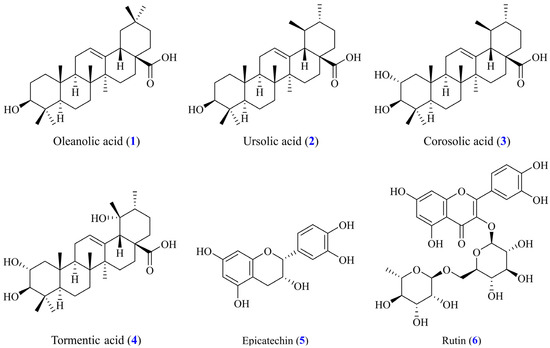 Chemical structures of oleanolic acid (1), ursolic acid (2), corosolic acid (3), tormentic acid (4), epicatechin (5), and rutin (6) from leaves of E. japonica.