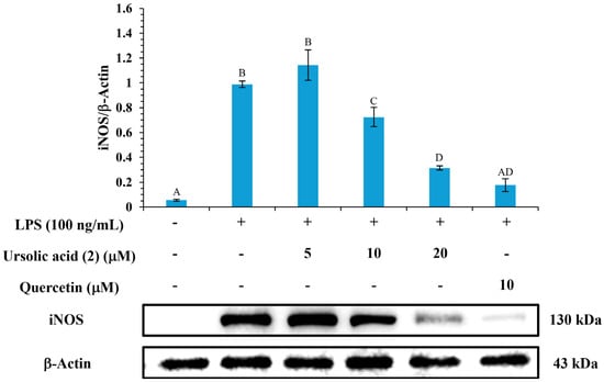 Effects of ursolic acid (2) and quercetin on expression of iNOS. Different letters (A, B, C, etc.) indicate statistically significant differences among groups (p < 0.05, Tukey’s test).