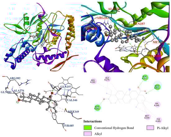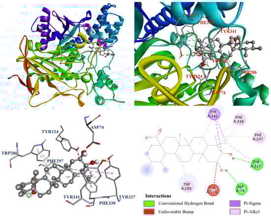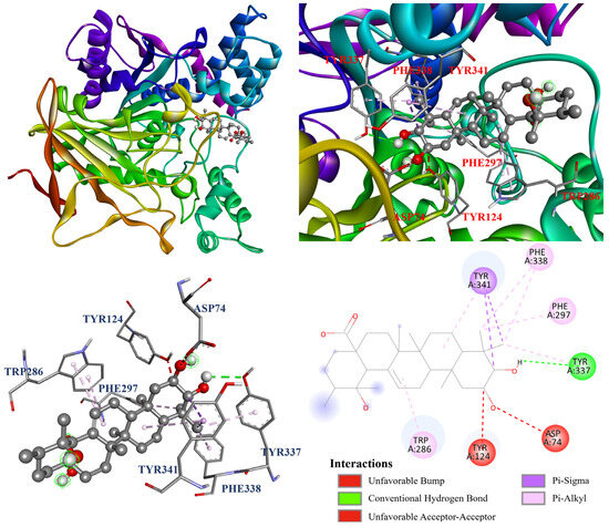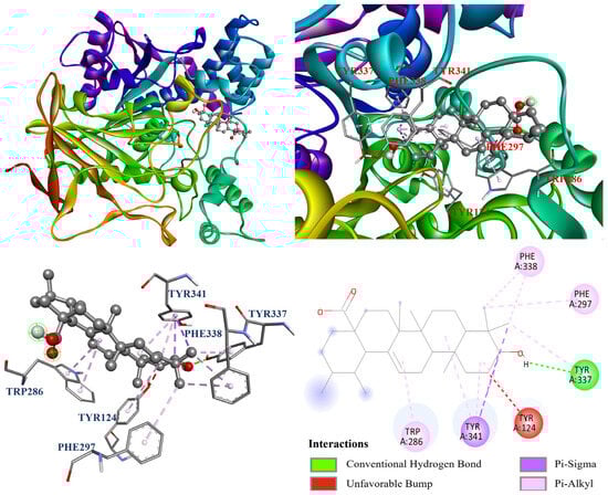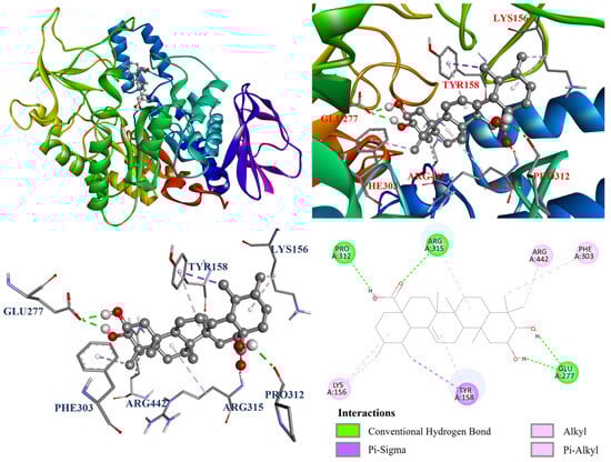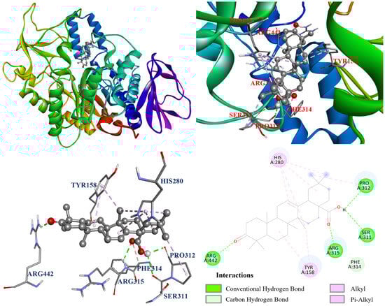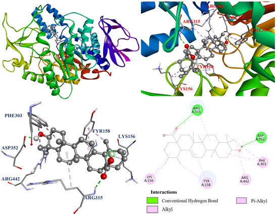 The interactions between the protein and ligand in the molecular docking model were further visualized by Discovery studio 2021 (Accelrys Software, Inc.; San Diego, CA, USA). The docking model of oleanolic acid (1) with PDB: 3A4A is shown in Figure 4. According to the results, oleanolic acid (1) formed four conventional hydrogen bonds with Ser311, Pro312, Arg315, and Arg442; one carbon hydrogen bond with Phe314; and seven alkyl and π–alkyl interactions with Tyr158, His280, and Pro312. On the other hand, Figure 5 demonstrated that ursolic acid (2) formed two conventional hydrogen bonds with Arg315 and Asp352; and eight alkyl and π–alkyl interactions with Lys156, Tyr158, Phe303, Arg315, and Arg442. As shown in Figure 6, corosolic acid (3) formed four conventional hydrogen bonds with Glu277, Pro312, and Arg315; one π–sigma interaction with Tyr158; and six alkyl and π–alkyl interactions with Lys156, Tyr158, Phe303, Arg315, and Arg442.