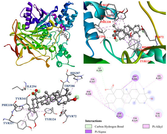 According to the AChE inhibition results in Table 5, triterpenoids, including oleanolic acid (1), ursolic acid (2), corosolic acid (3), and tormentic acid (4), exhibited stronger AChE inhibitory activities compared to the positive control, chlorogenic acid (IC50 = 320.25 ± 4.13 μM). Among the isolated components, tormentic acid (4) demonstrated the most potent AChE inhibitory activity, with an IC50 value of 281.05 ± 8.55 μM, followed by corosolic acid (3) (IC50 = 282.81 ± 16.97 μM), oleanolic acid (1) (IC50 = 306.78 ± 12.14 μM), and ursolic acid (2) (IC50 = 310.82 ± 7.31 μM).