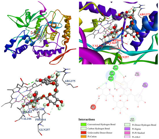 Furthermore, the molecular docking models of ursolic acid (2) and rutin (6) were also visualized and are illustrated in Figure 11 and Figure 12. As shown in Figure 10, ursolic acid (2) displayed three conventional hydrogen bonds with Gln257, Gln381, and Hem901; and eight π–alkyl and alkyl interactions with Ala276, Val346, Met349, Arg382, and Tyr485. Additionally, Figure 11 shows that rutin (6) performed three conventional hydrogen bonds with Gly365, Trp366, and Hem901; a π–donor hydrogen bond and carbon hydrogen bond with Gln257; π–σ interaction with Val346; a π–π stacked interaction with Hem901; π–cation interaction with Hem901; and two π–alkyl interactions with Pro344. Notably, there is an unfavorable donor–donor interaction with Arg375, which resulted in its lower NO inhibition relative to ursolic acid (2).
