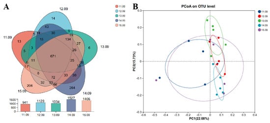 (A) Effects of different dietary protein levels on OTU of cecal microbiota in Ningxiang pigs at the fattening stage. (B) Principal coordinate analysis (PCoA) of microbial composition in the feces of growing pigs (based on the Bray–Curtis distance).